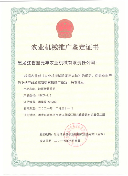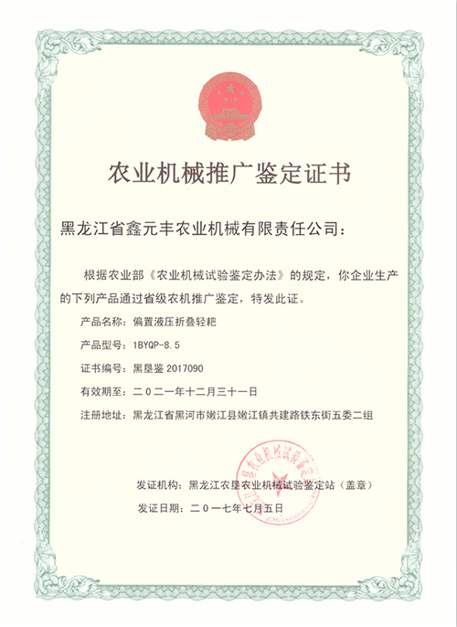 1BYQP-8.5偏置液壓折疊輕耙推廣證書
