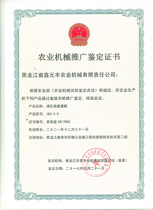 1BZ-4.0偏置重耙推廣證書